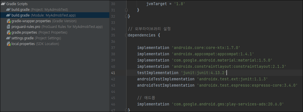 저는 디펜덴 시스를 외부 라이브러리 설정과 이번에 받아 온 것을 애드몹이라고 주석 처리해주었습니다.