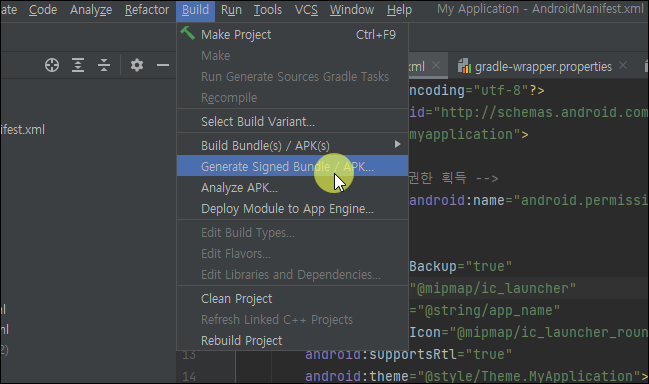 이제는 앱을 추출해보겠습니다. 이미지도 만들었고, 이름도 만들었으니까 추출을 해줘야 하죠. APK 파일로 추출할 수 있고, 번들로 추출할 수도 있습니다. 먼저 APK 파일로 추출을 먼저 해보겠습니다. 번들의 장점은 용량이 적어서 요즘 구글 스토어에서 더 좋아한다는 것이고, apk는 저희에게 익숙하다는 그런 장점을 가지고 있겠네요. apk파일을 만들다니.. 신기합니다. 이것으로 설치도 하고 그랬던 것 같은데, apk파일을 만들다니..! 일단 만들어보겠습니다.