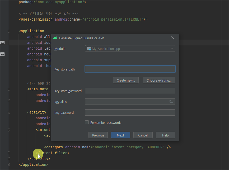 이곳에 들어오시면 이와 같은 화면이 나옵니다. 여기서 key stort path에 파일을 눌러서 위치 저장될 곳을 넣어주세요. 저는 어플리케이션 만들었던 곳에다가 넣어두었습니다. 이름은 key라고 적어놨어요. 그리고 파일은 jks네요. 패스워드들은 6자리 이상으로 넣어주시면 됩니다. key는 자동이고 이름까지 짓고 암호를 입력하시고 ok를 누리시면 됩니다.