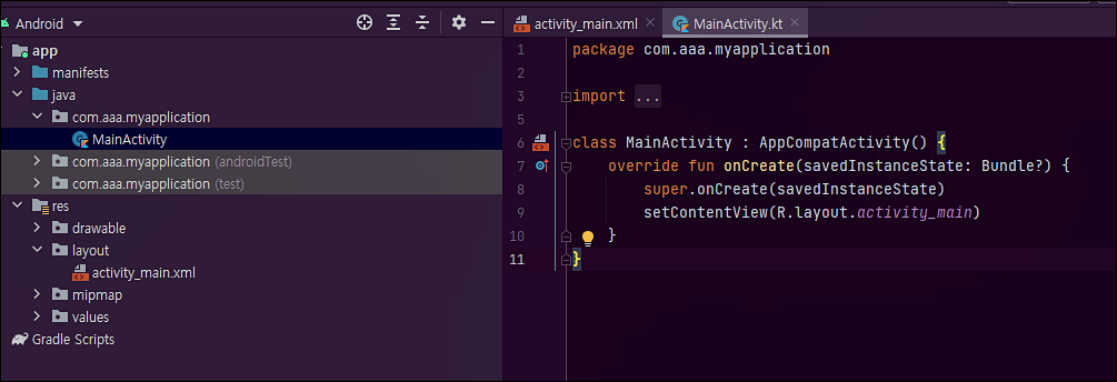 제목을 참고로 abc에서 myapplication으로 변경하였습니다. 그냥 제목이니까 신경 쓰지 않으셔도 됩니다. 왼쪽을 보면 java부터 res 이런 것들이 적혀있습니다.