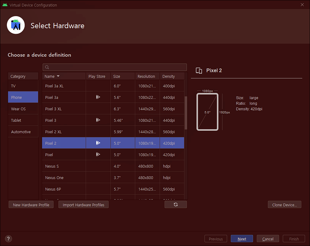 그럼 위와 같이 폰 생성이 나옵니다. 저는 그냥 픽셀 2로 진행하겠습니다.