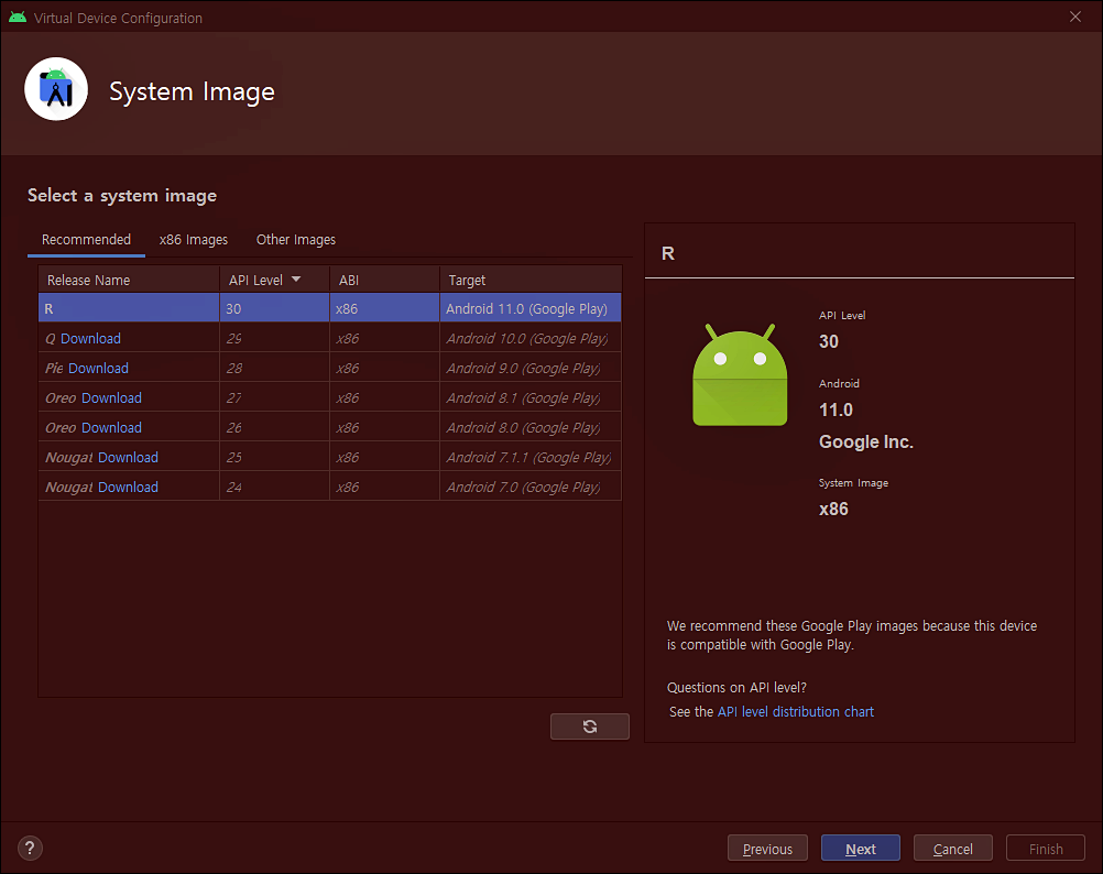 그럼 위와 같이 폰 생성이 나옵니다. 저는 그냥 픽셀 2로 진행하겠습니다.