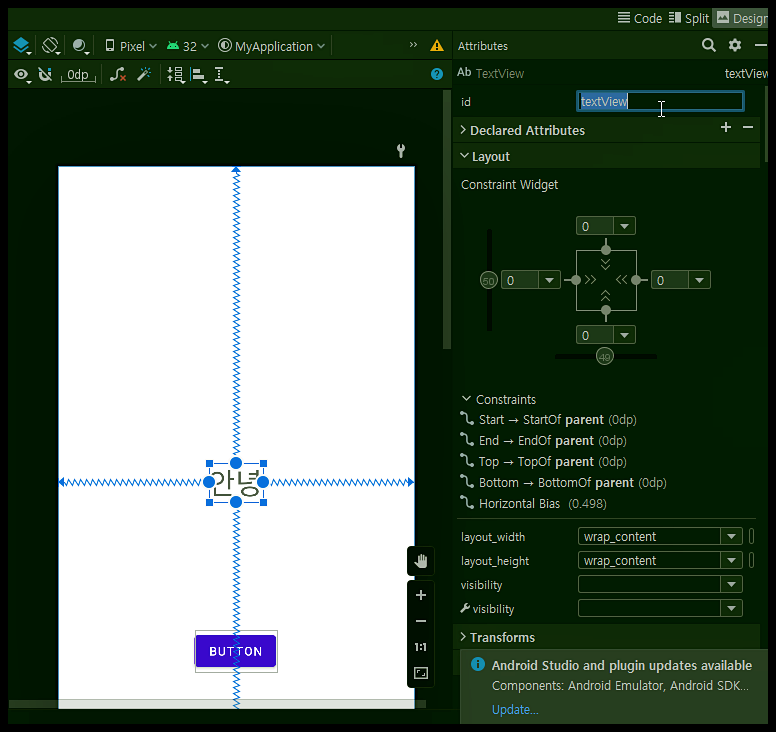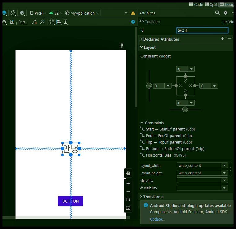 저번에는 어플에 글을 쓰고, 제한조건 레이아웃으로, 글을 가운데 정렬까지 해봤습니다. 오늘은 위젯끼리의 위치를 조정해보겠습니다. 위젯 위치를 변경하는 것에 대해서도 조금 더 자세히 해