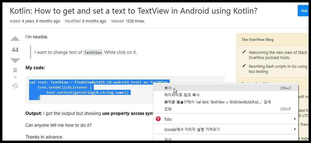 그러니까 먼저 Kotlin을 바꾸려고 하는 거잖아요? 그리고 텍스트 뷰를 바꾸려고 하는 것이니까, TextView change text를 칩니다.