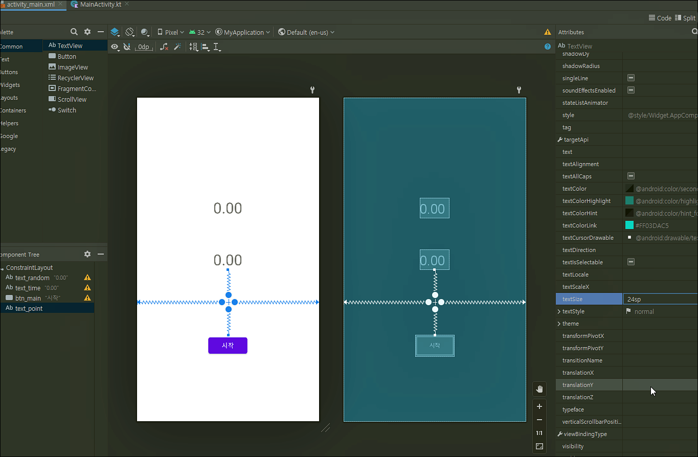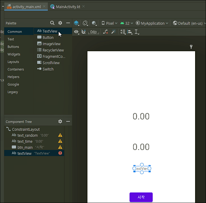 액티비티 메인에서, 텍스트 뷰를 끌어서 제가 원하는 위치에 두었습니다.